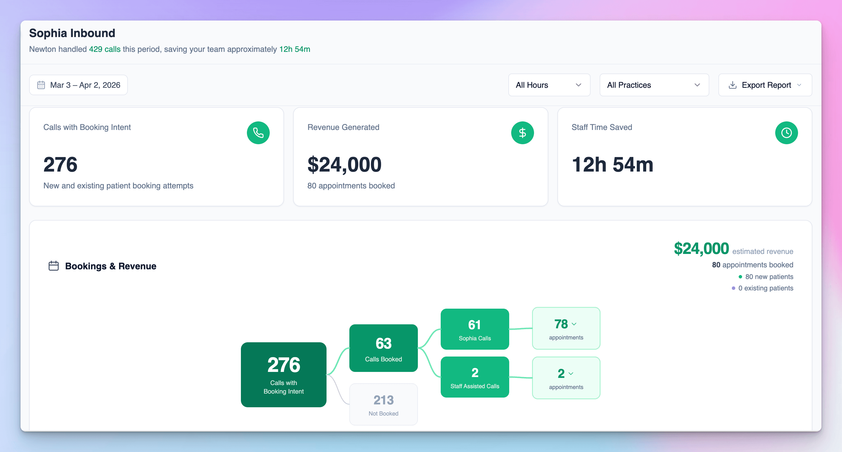 Newton is helping introduce a new way of thinking about the phones, not just as a tool for answering calls, but as a source of insight into patient behavior, team performance, and missed opportunities. Instead of spending time searching for gaps and problems within your system, Newton handles the busy work in the background and surfaces what matters so that you can focus on improving them.