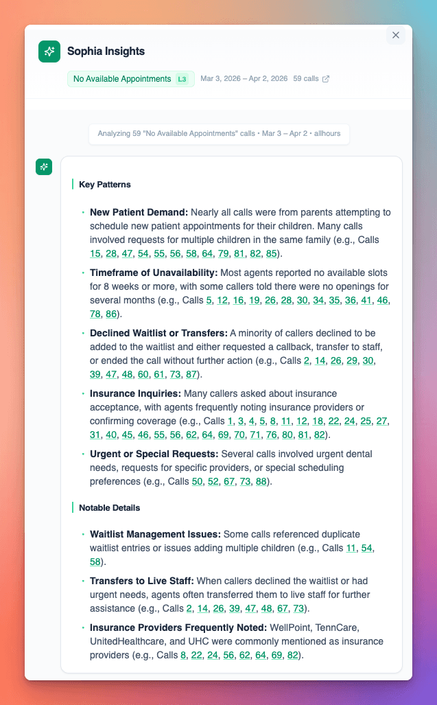 As a solution to this problem, Newton has introduced AI call analytics as a new feature designed specifically for dental practices. Instead of simply recording calls, Newton analyzes them. It looks at patterns across conversations and surfaces insights that would be nearly impossible to catch manually. This includes how calls are being handled, where patients are dropping off, and what tends to lead to a successful booking. AI call analytics in dentistry is still a very new area, and Newton is one of the first to bring this level of visibility into everyday front desk operations. With this new feature, you can click through to specific subsets of calls, and listen to them, in addition to getting Sophia’s insights and analysis on what’s happening.